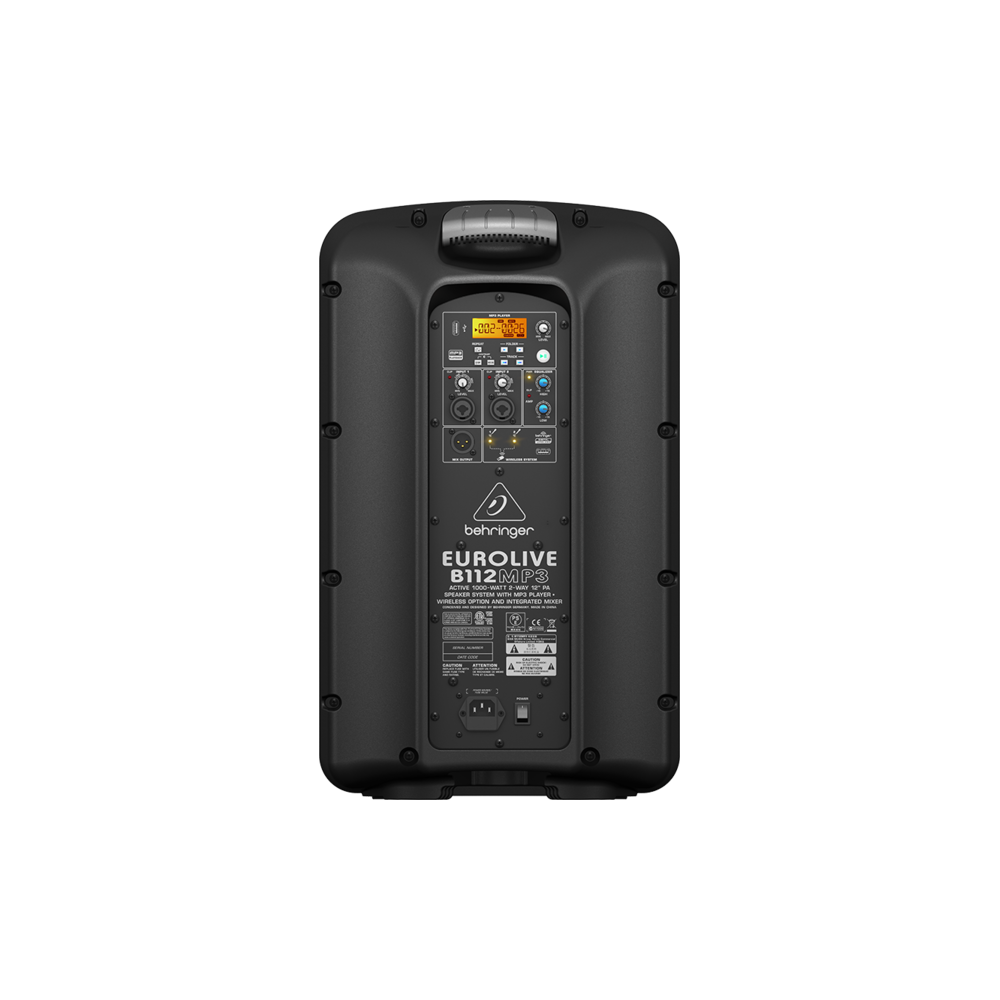 Behringer B112MP3 Акустическая система активная, 2-х полосная, 12", 1000Вт, усилитель класса D, встроенный микшер, порт для подключения беспроводного радиомикрофона, МР3 плеер