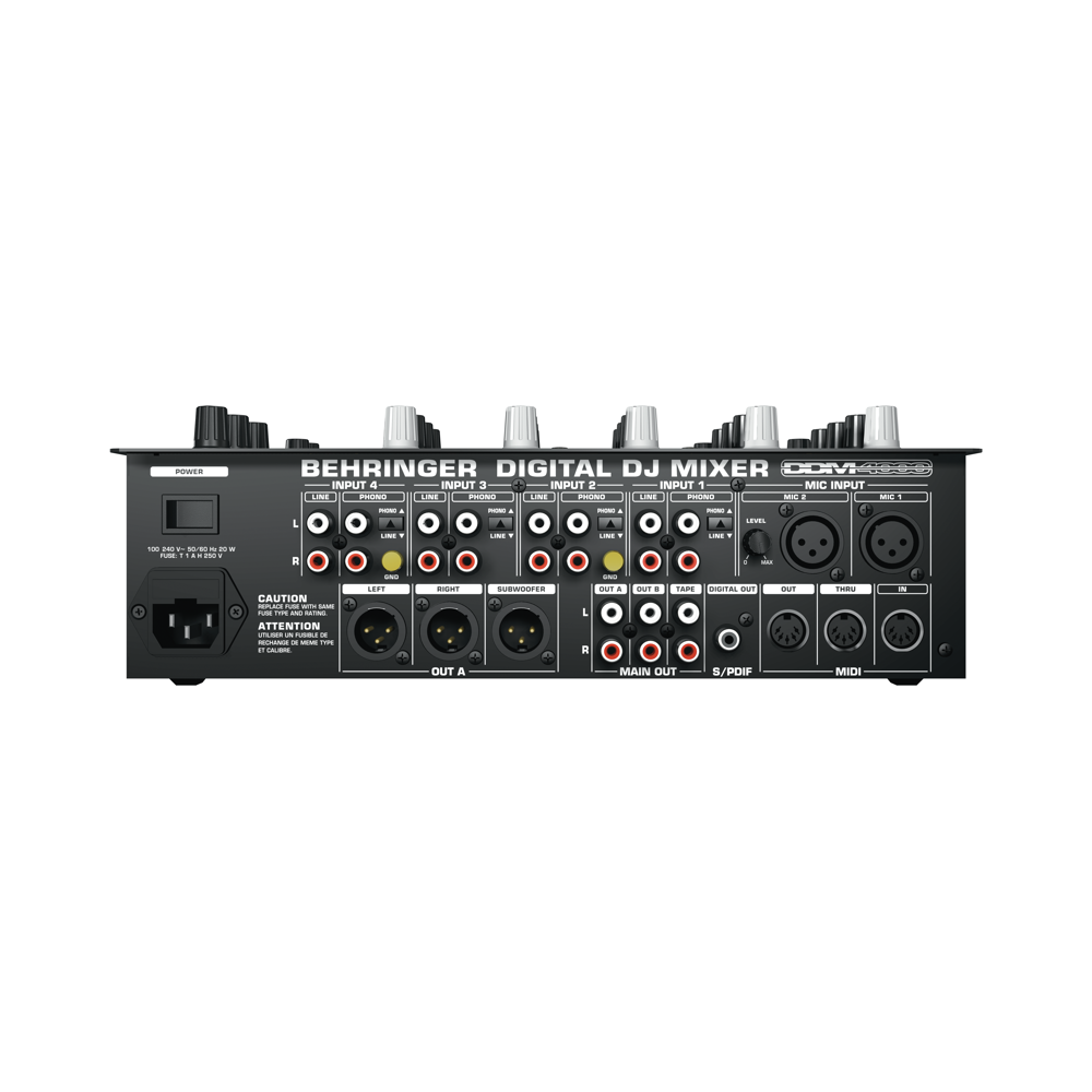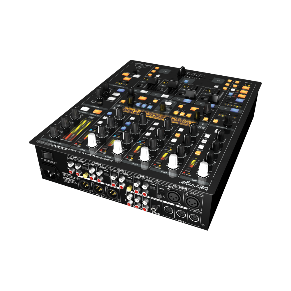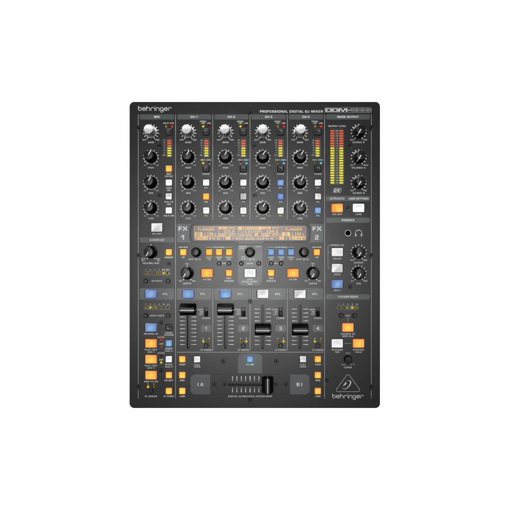 Behringer DDM4000-EU Микшерный пульт DJ цифровой, 32-бита, 5 входов (4 стерео, 2 микрофонных) с сэмплером, 4 секции эффектов, двойной счетчик BPM и MIDI )