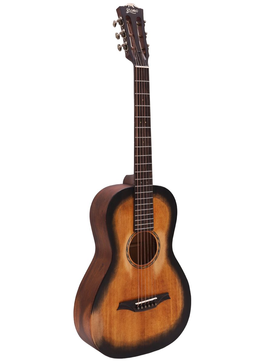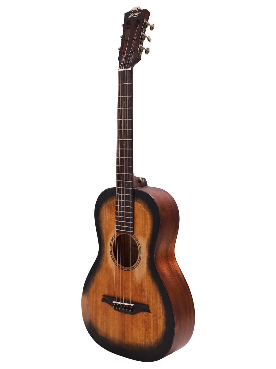 Bromo BAR6H hs Гитара акустическая Parlor, верхняя дека: цельная ель, нижняя дека и обечайка: цельный махагони, гриф: махагони с двумя эбеновыми вставками, накладка грифа: макассарский эбен, двухсторонний анкер, колки: винтажные "Bromo" античная латунь, матовая, в чехле