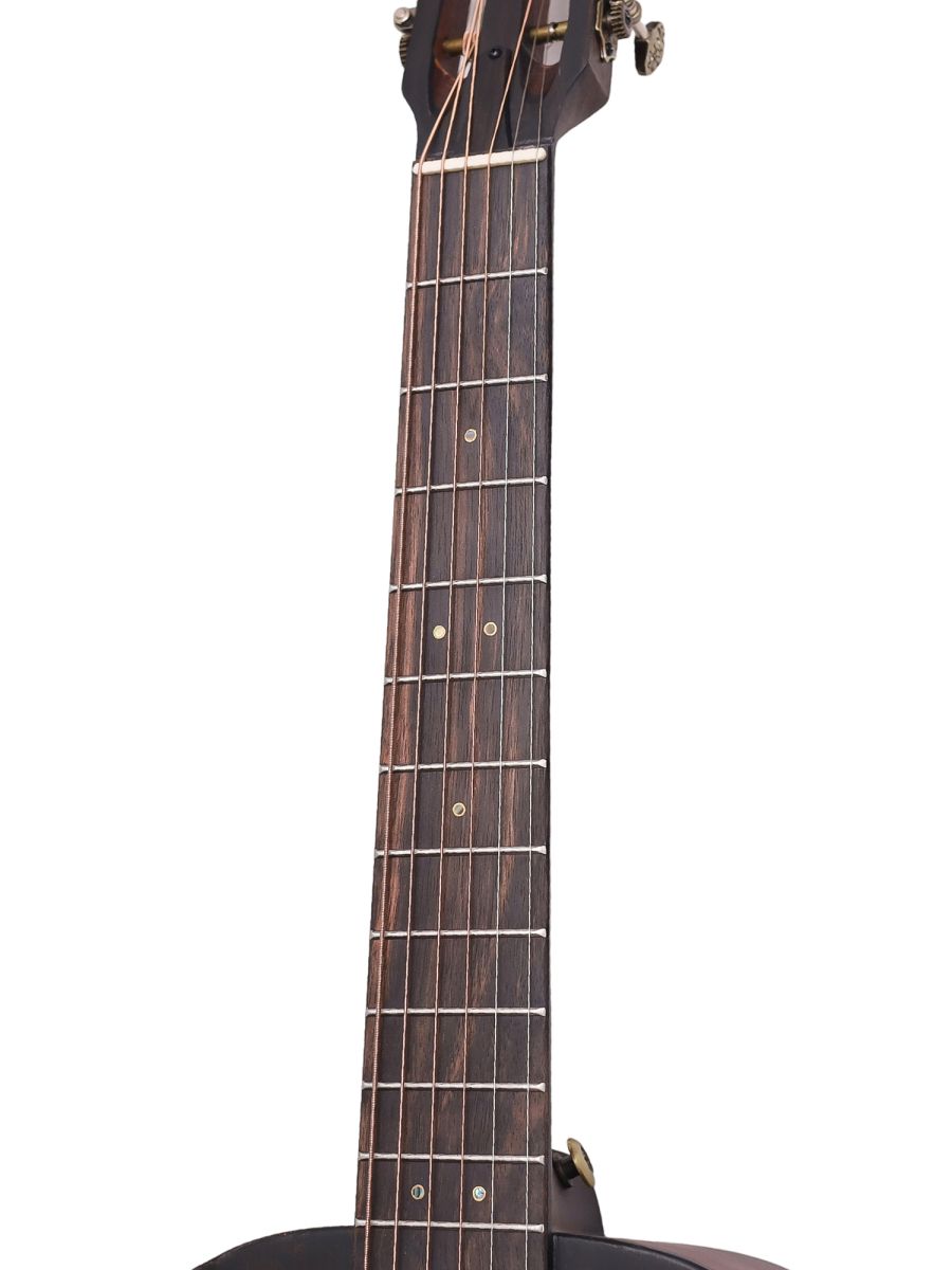 Серия: Rocky Mountain Форма корпуса: Parlor Мензура: 632,4 мм (24 29/32") Ширина грифа: 47 мм (1 27/32") Верхняя дека: цельная ель Нижняя дека и обечайка: цельный махагони Гриф / накладка грифа: махагони с двумя эбеновыми вставками / макассарский эбен Анкерный стержень: двухсторонний Инкрустация на грифе: перламутр Лого на голове: гора Бромо Оформление резонаторного отверстия: «Ковбойская веревка» Бридж: "Орлиное крыло", черное дерево Amara Оформление грифа и пятки: гора Бромо Лады: Jumbo, 20 ладов Верхний и нижний порожки: кость Колки: винтажные "Bromo", античная латунь Отделка: матовая В комплекте: чехол