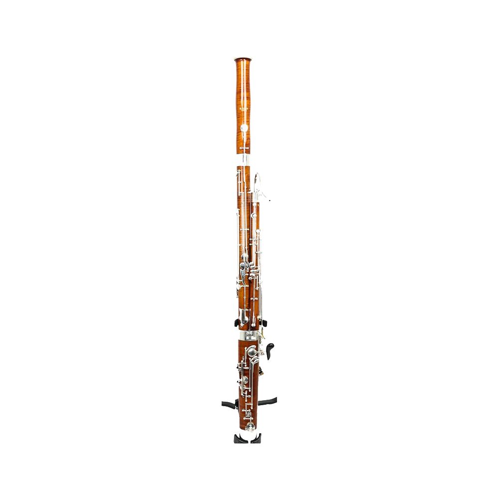 Moosmann 150E Фагот клен, мореный коричневато-красным лаком, 26 клапанов, покрытого серебром. Установлен клапан верхнего Ми. Перемычка от октавного клапана Ля к «бесшумному» клапану (пиано механизм «Whisper key»)