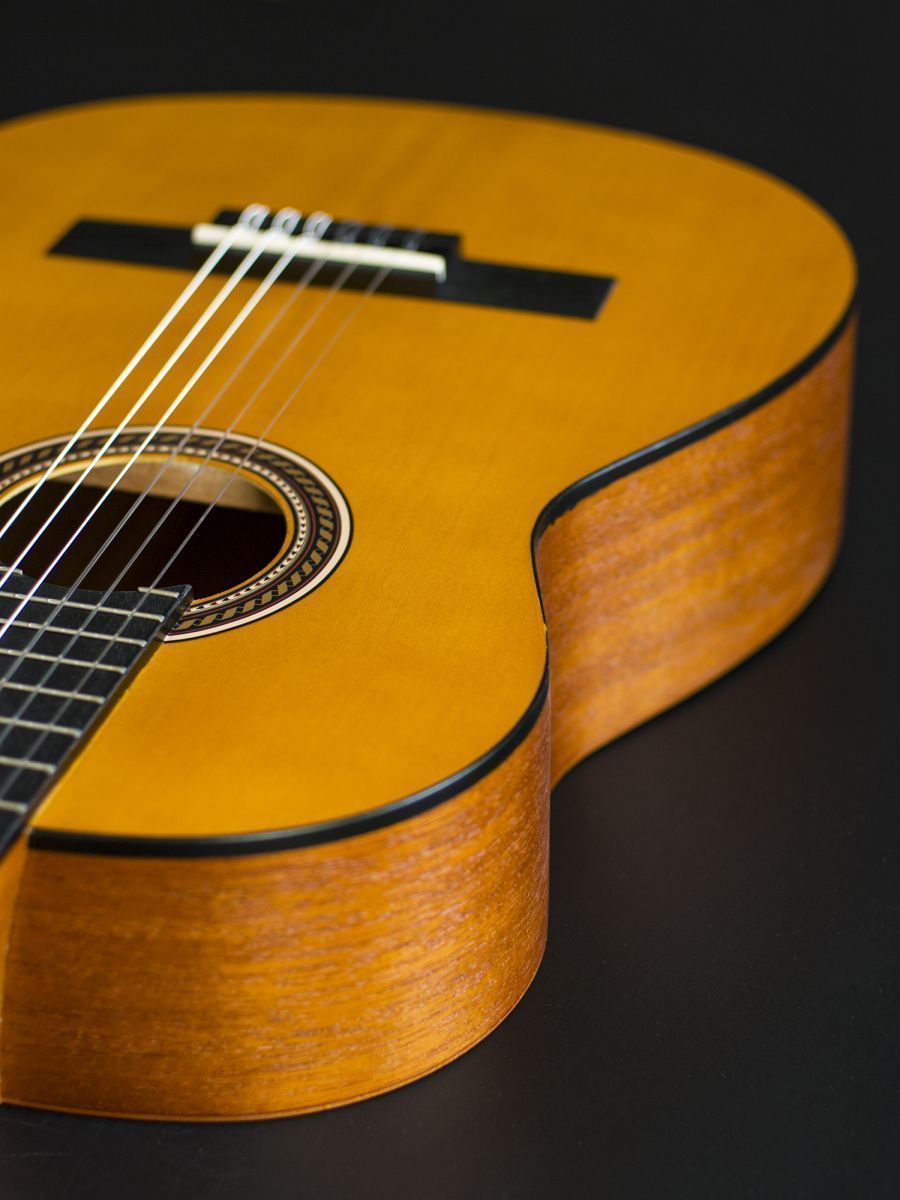 Valencia VC203HL — качественная классическая гитара 3/4 с узким грифом, предназначенная специально для людей, лучше владеющих левой рукой. Верхняя дека из ели даёт яркость и чёткость звучания, подчёркивает верхние и средние частоты. Нижняя дека и обечайка из нато добавляют глубину и объём, обогащают нижние частоты. Гриф и накладка из махагони вносят мягкость и теплоту в общий тембр, сглаживают резкие обертоны. Нижний порожек из махагони гармонично дополняет звучание грифа, передаёт вибрации без потерь. Колки винтажные никелированные обеспечивают плавный ход, точную настройку и надёжное удержание строя. Натуральный цвет подчёркивает текстуру древесины и придаёт инструменту классический вид. Матовое покрытие сохраняет естественный рисунок ели и нато, не создаёт бликов при сценическом освещении и устойчиво к мелким царапинам и отпечаткам пальцев. Valencia VC203HL – это инвестиция в ваше музыкальное развитие. Приобретая эту гитару, вы получаете надежный, красивый и удобный инструмент, который будет радовать вас своим звучанием долгие годы.