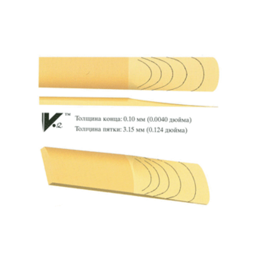 Трости V.12 вырезаны из тростниковых трубок с таким же диаметром, как у тростей для саксофонов. Поэтому у них более толстая пятка, более длинный скос и немного более толстый конец, чем у традиционных тростей. Более длинный скос обеспечивает удлиненную зону вибрации, что дает более глубокий, богатый звук. Утолщенная пятка дает звуку насыщенность при быстрой игре и увеличивает срок службы трости.